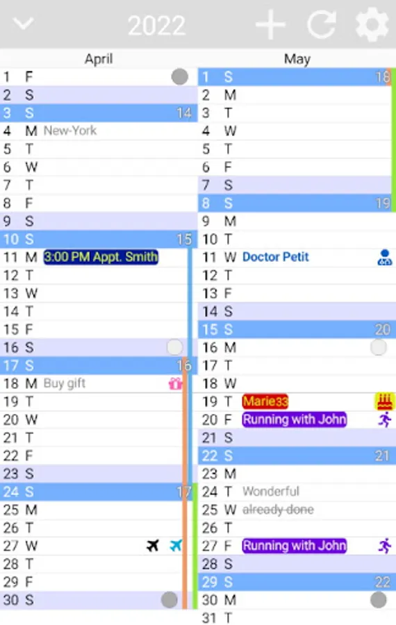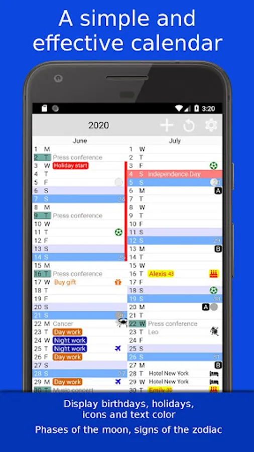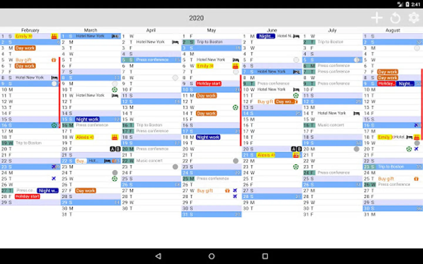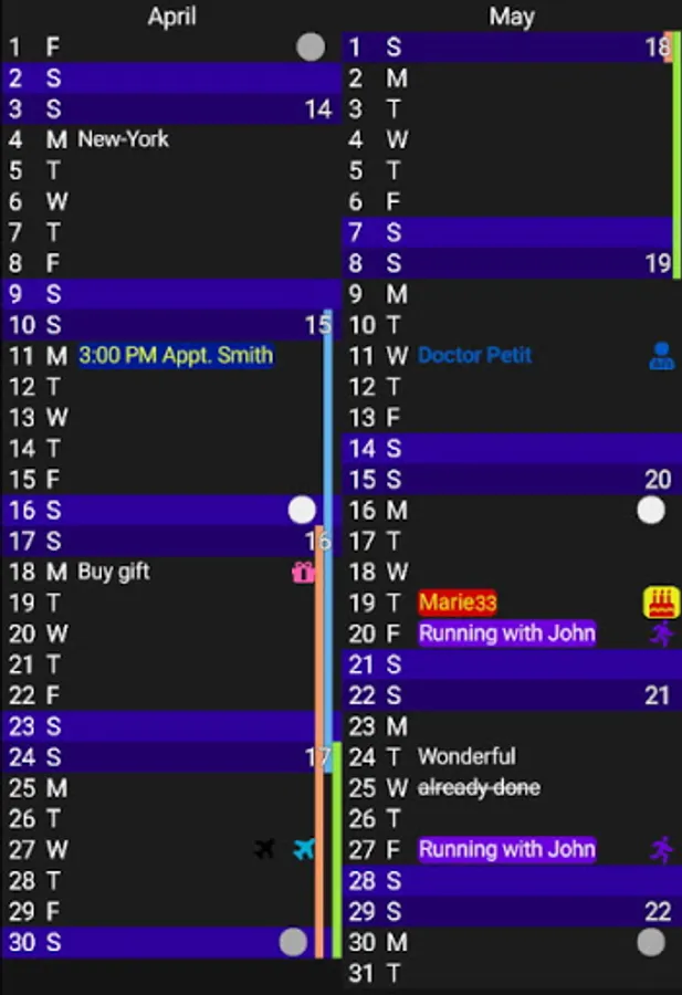 ▪ Add custom events with text & background color, icons, birthdays (age) 🎂, night work, holidays (vertical bar), ... directly in the calendar.