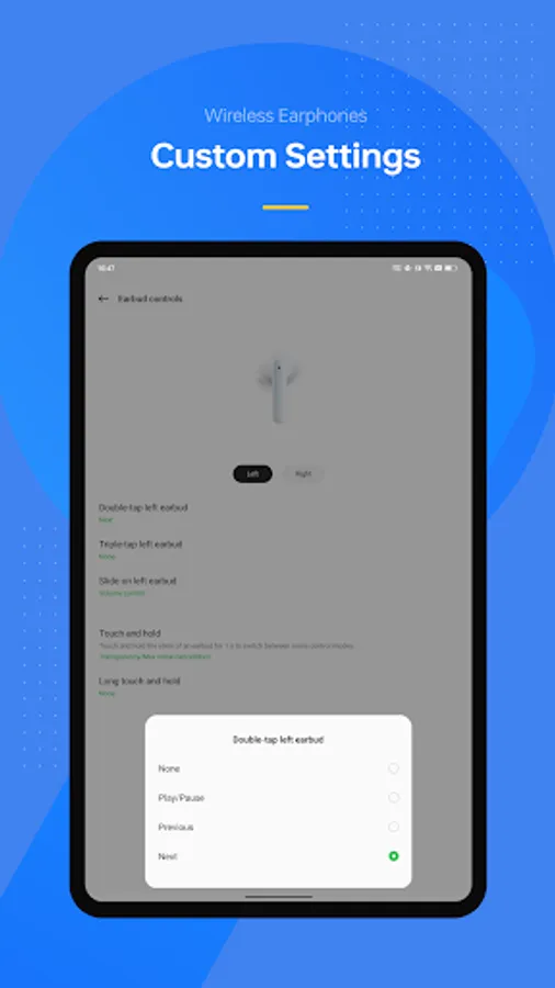 You can quickly view battery levels of your left and right earbuds, modify the headset operation and headset firmware upgrade. Pairing your earbuds with your phone is a snap with Wireless Earphones.
