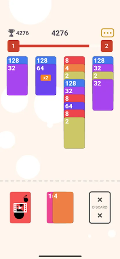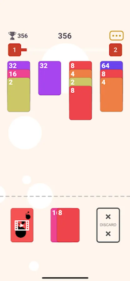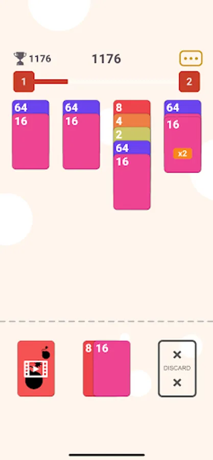 - Chain cards in slot to increase score multiplier. e.g. (64 + 32 + 32) will give you 2x multiplier on score and so on.