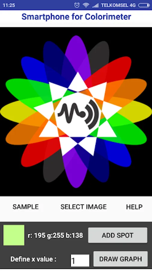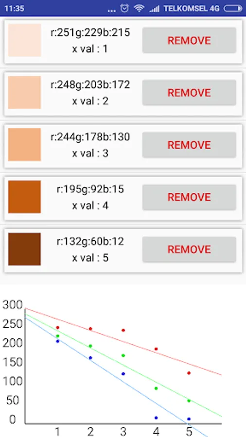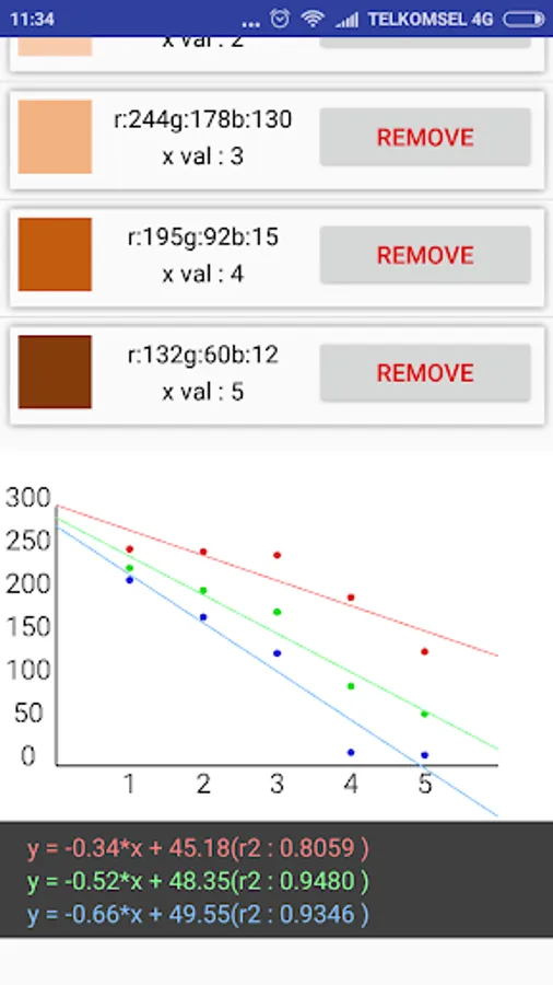 Use your smartphone as Colorimeter to measure the color intensity (RGB) of an image. This app also creates the linear regression of color intensity vs defined value (concentration) and use the resulted regression linear equation to calculate the predicted x (concentration) value.