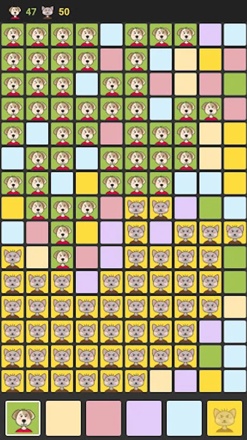 To make a move, click on the color block at the bottom of the screen. You can choose any color except the opponent's color. The color of all the player's cells changes to the selected one. All adjacent cells of the selected color are absorbed and are considered captured.