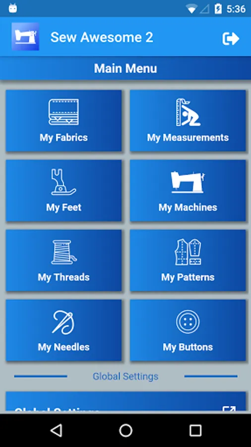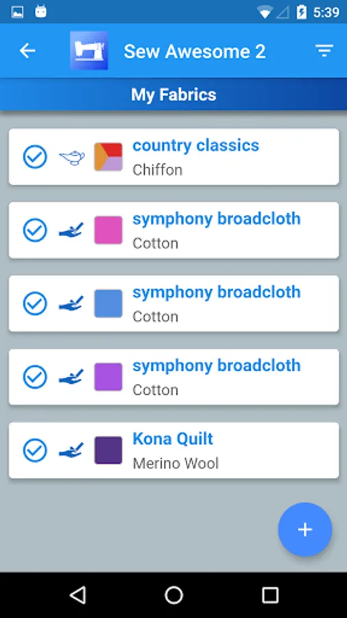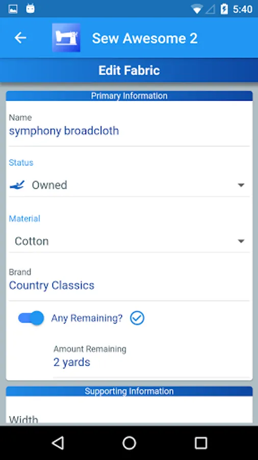 All data is stored in the cloud, so it is available across multiple devices. Store detailed information about each of the sewing categories above. Pro users can add pictures and PDFs to each item.