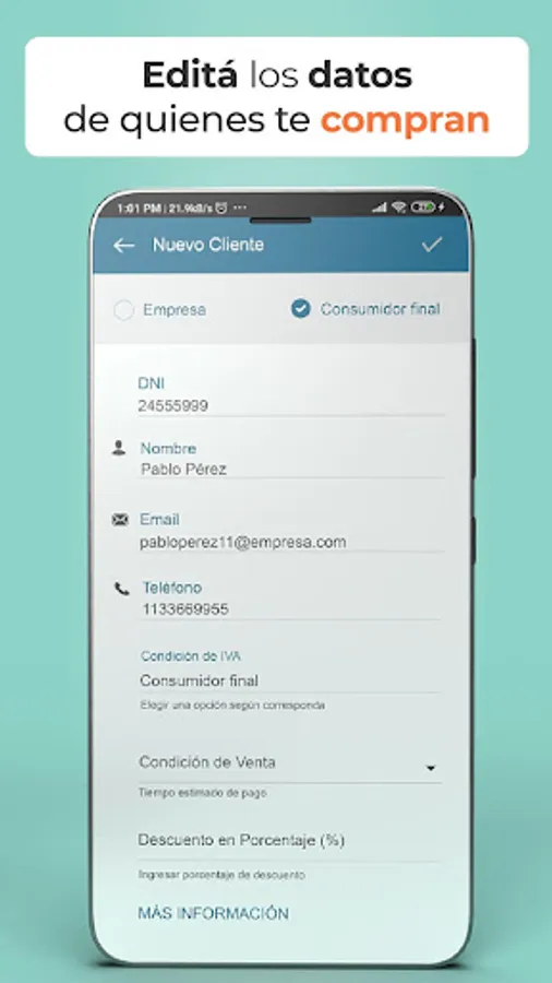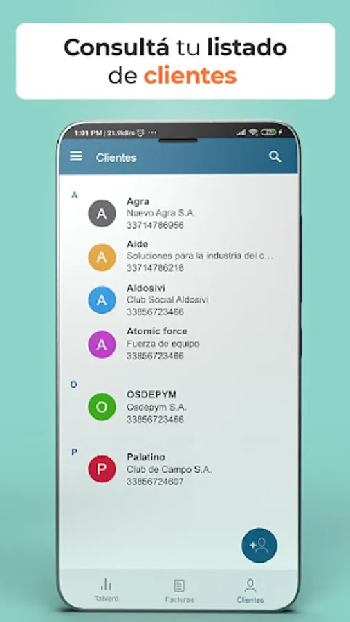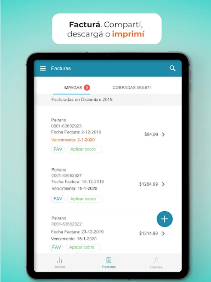 - View a list with all your clients. Search them by name, CUIT or company name. Add new customers in this instance or while generating an invoice.