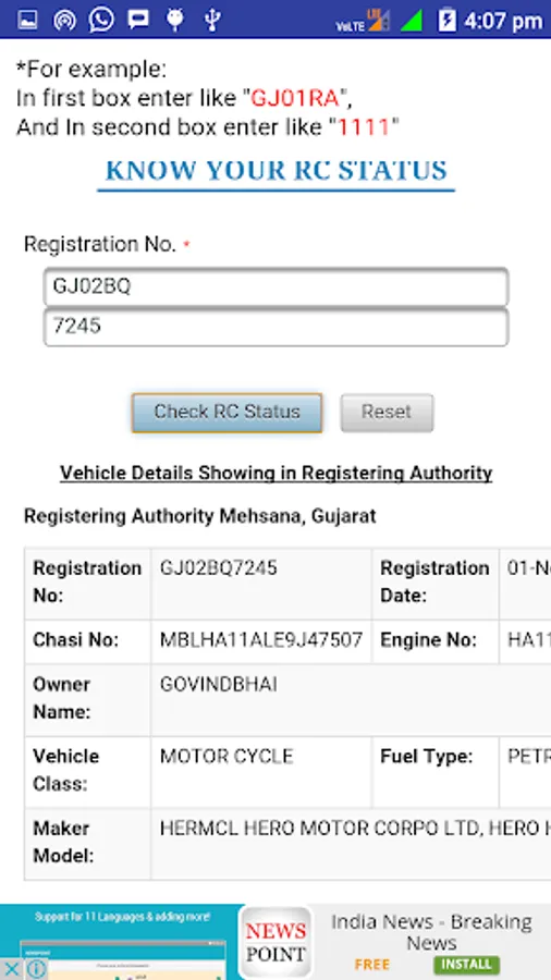 3. You no more need to go to Regional Transport Office (RTO) to get these details for a car, bike, truck, taxi, scooter or any other Indian Vehicle!