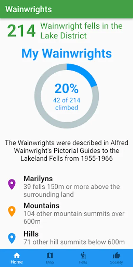 The 214 Wainwright mountains and hills were established by Alfred Wainwright in his Pictorial Guides to the Lakeland Fells in the 1950s and 1960s.
