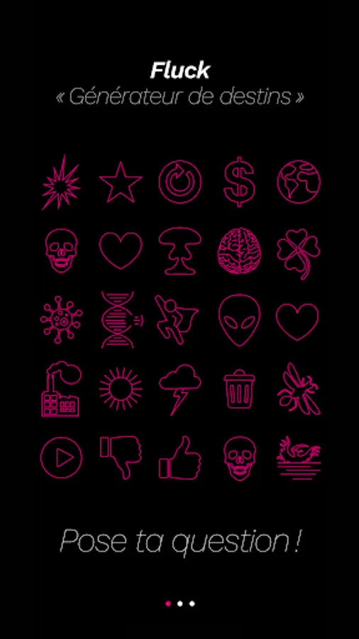 FLUCK is an easy-to-use application that leads you to question yourself precisely on a subject or theme of your choice; to state a question and activate a double roll that will turn fate upside down.