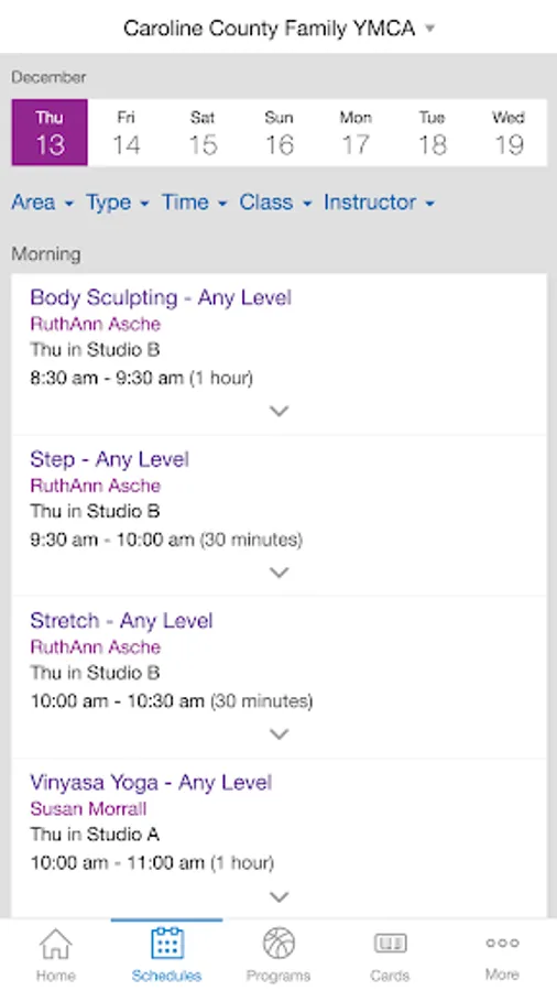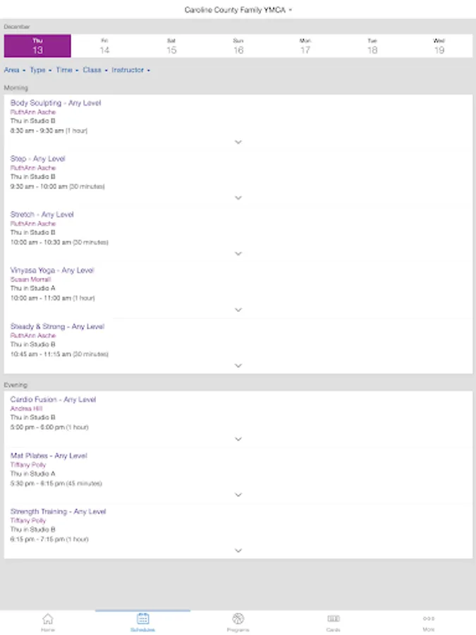 • Easily view schedules for each day and filter for the types of classes that you like.