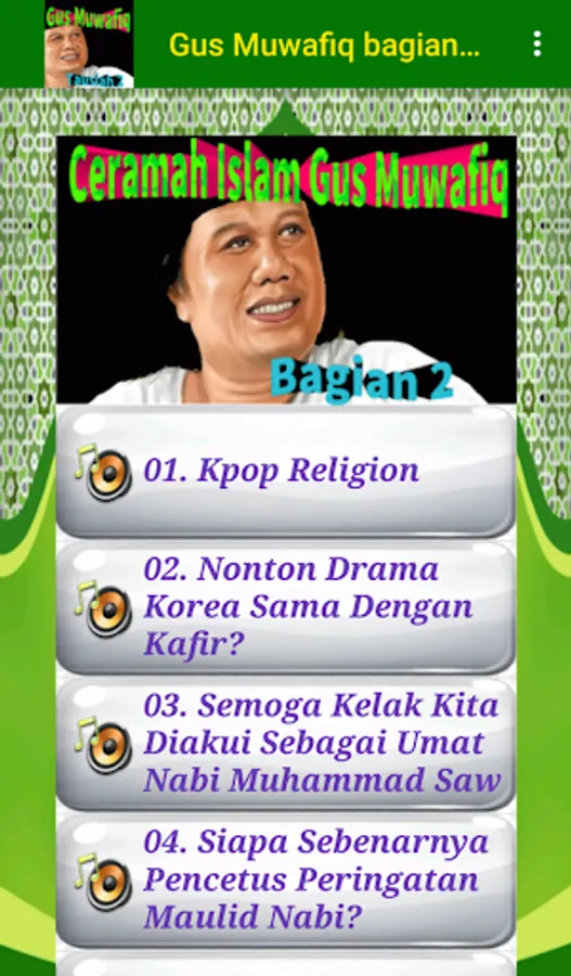 Again, the Islamic Android Application is presented to fill Muslim days with lectures (tausiah) from prominent religious teachers and scholars. This time presented the second part of a collection of tausiah (lectures) from Gus Muwafiq on various themes such as Kpop Religion, Watching Korean Drama Equals Kafir ?, Who Actually Founded the Commemoration of the Prophet's Birthday ?, etc. Install and enjoy the pithy tausiahs full of nuances of Nusantara Islam which were initiated by the largest Islamic organization, Nahdlatul Ulama (NU).