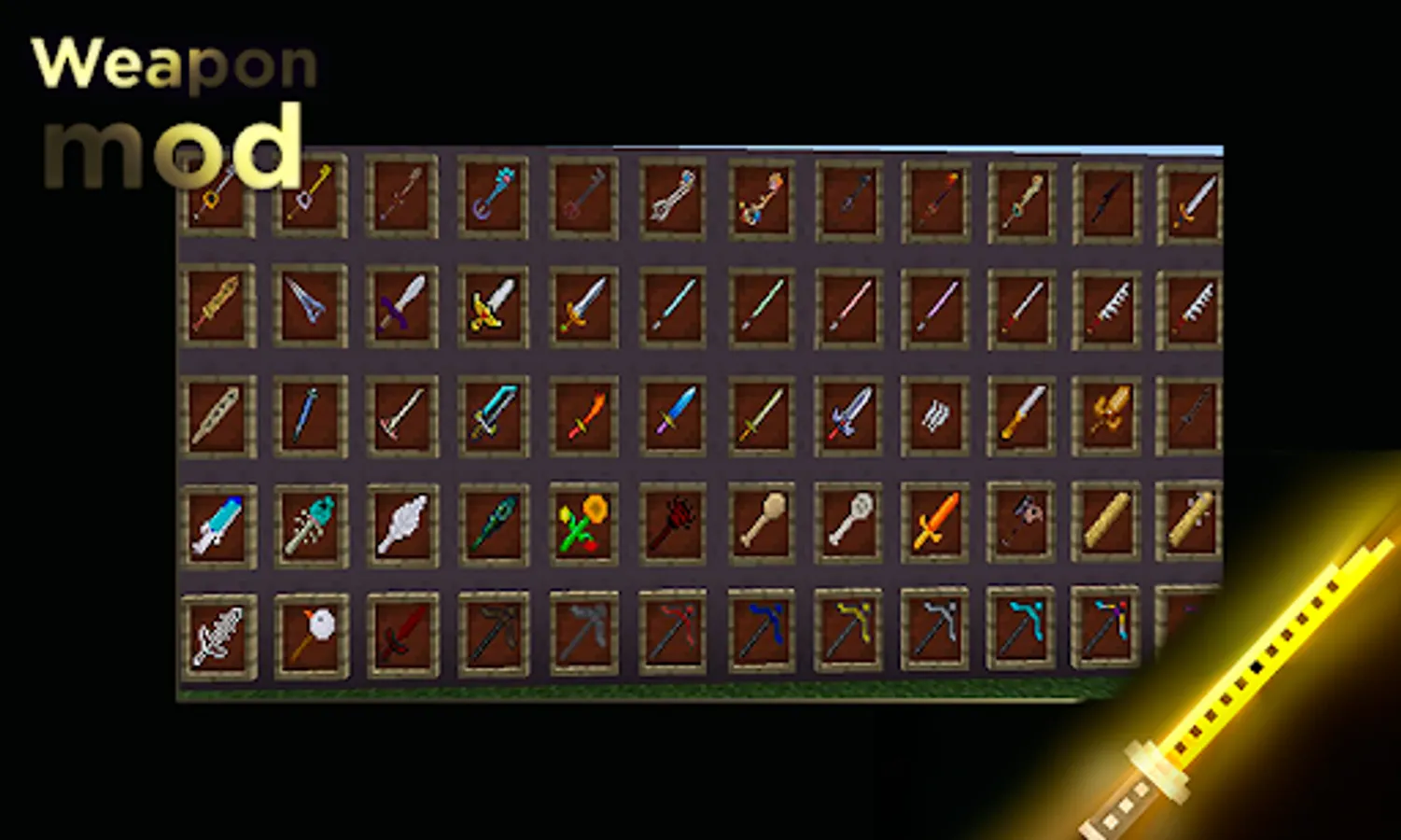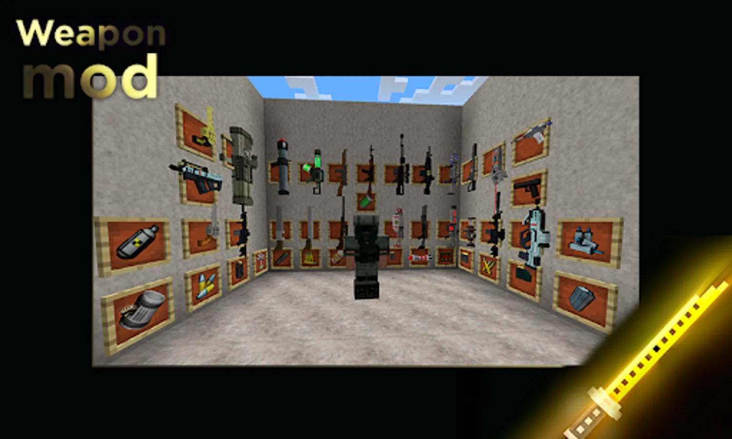 Weapon Mod for Minecraft PE will please every fan of shooting games with a huge collection of modern and powerful weapons. You can use a rifle, pistol, submachine gun, bow, and other weapons at any time. It is worth noting that different variations of the same type of weapon can be presented in the application. You will not be able to create a new type of weapon that is not included in the catalog of Weapon Mod for MCPE. But if you manage to kill the mob, you will get a box with resources that can be used to craft a new sword.