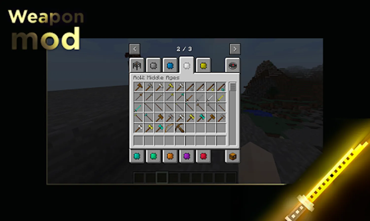 2. Get elemental swords in Creative Mode. You should go to a special tab to find mods. After that, you will see the available options.