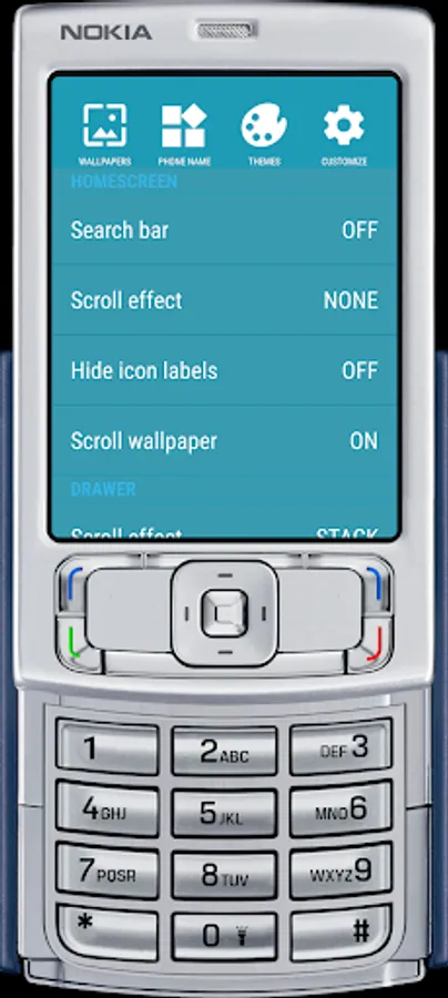 -Nokia Launcher 2022: Setting screen with many options as wallpaper, phone name, Nokia theme for android