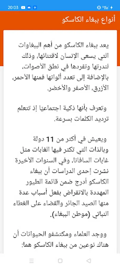 Parrots prefer to live in warm places to live in cold places, and they have sharp beaks that they use to eat grains, seeds, some fruits and insects, and sometimes swarms invade and eat oil palm crops, which raises the concern and fear of farmers. The length of the parrot is about 33 cm, and it lives for years. Many of them can live for many years, up to eighty years, and the beholder can confuse the male and female due to the similarity of the colors of their feathers, and it is worth mentioning the presence of certain colors associated with some regions of the world such as the parrots of the Amazon region, which are characterized by their green feathers, or a parrot The region of Mexico in Central America, which is characterized by its bright yellow feathers, and parrots generally become aggressive in the breeding period due to the struggles that the males wage to win the female.