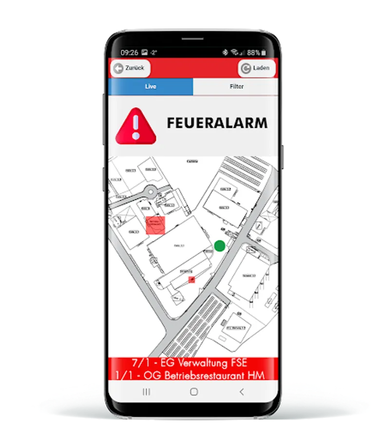 The most complex but also the most convenient way of displaying is to display interactive site plans. With this type of display, the symbols / areas must be parameterized in advance for each incoming type of message. The display on your device is self-explanatory and can be understood by any end user without instruction.