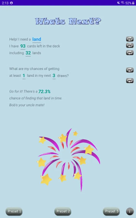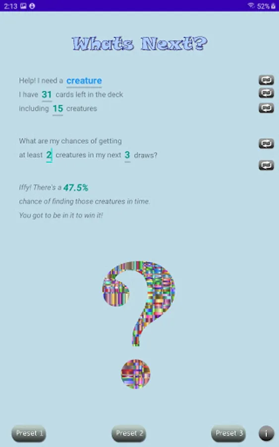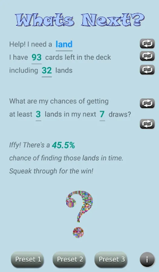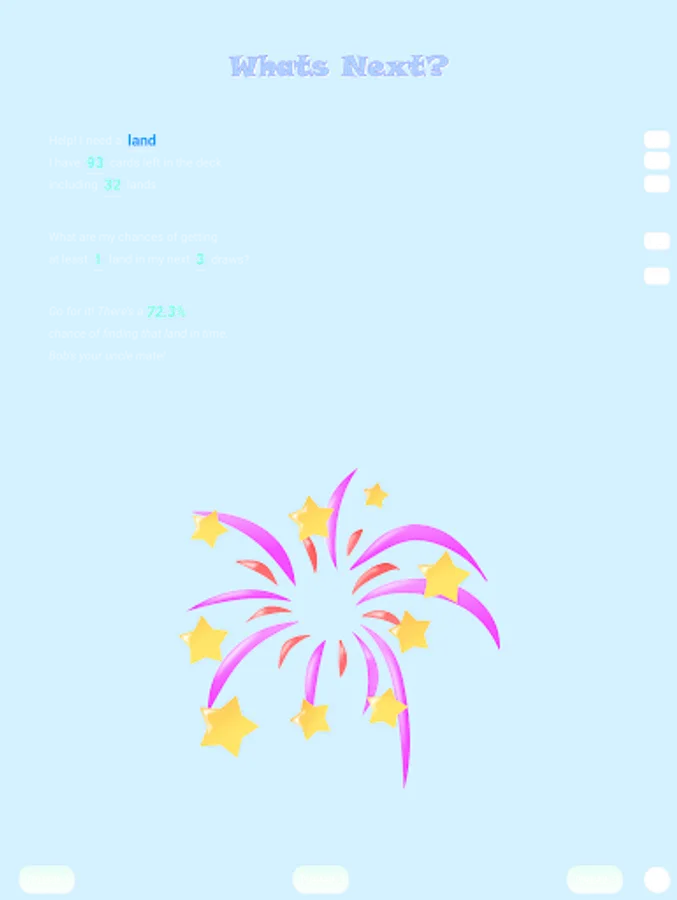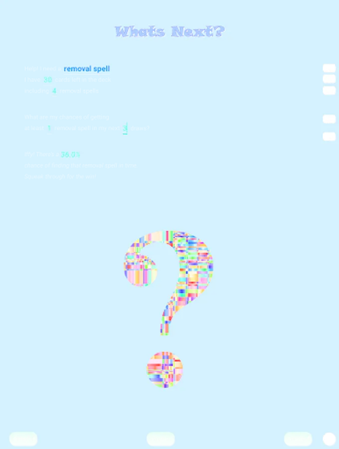 Whats Next calculates the probability of drawing a specific needed card in games like Magic the Gathering (MTG). There are many great websites that let you do this, but they ask you to understand obscure symbols like N, K, n and k and it can be confusing to work out what information to provide.
