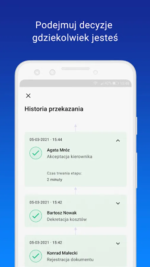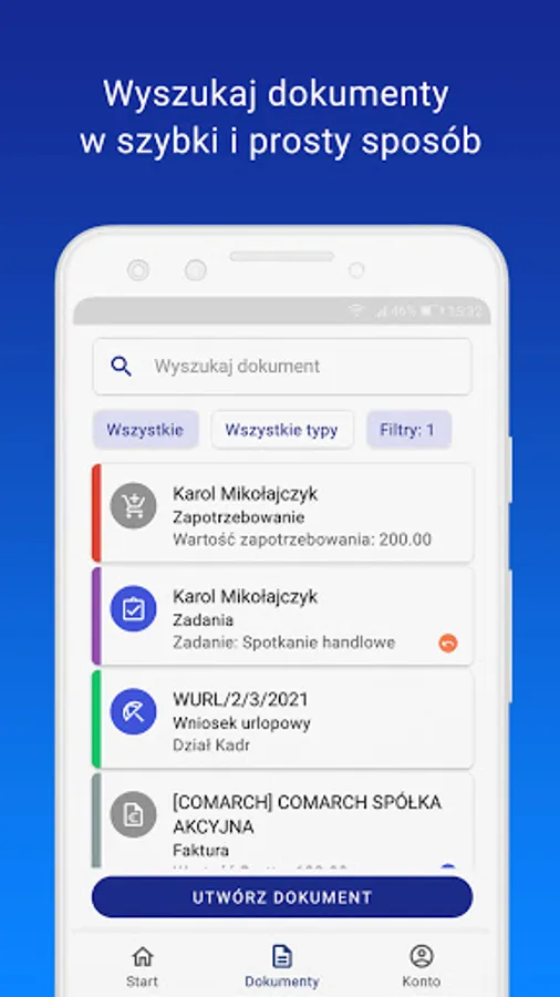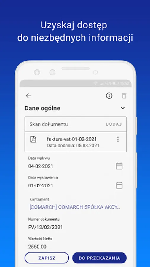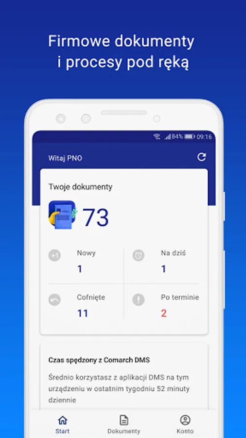 The Comarch DMS mobile application provides the ability to work with documents from anywhere, thanks to which the time necessary for the implementation of specific steps and tasks is significantly reduced, and all information is always available at your fingertips.