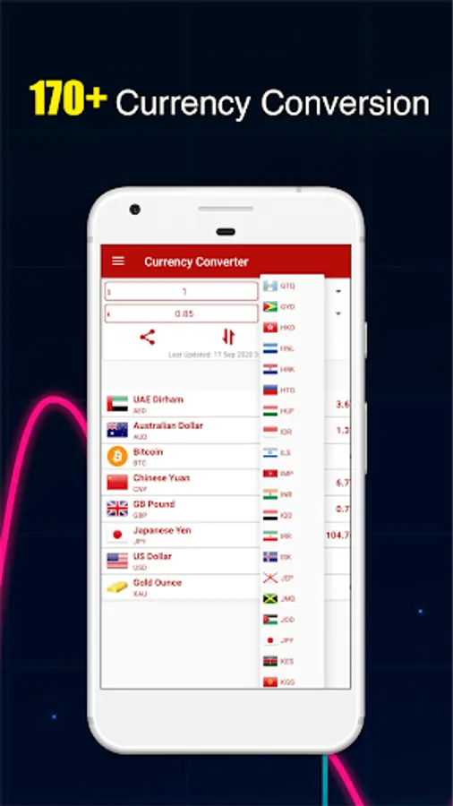 Just open the free currency converter app, it will update the exchange rates everytime if internet is connected. You will be navigated to the main screen where you can select different currencies from 170+ offline available forex rates. You then just have to type in the amount you want to exchange to any currency like euro to dollar, pound to dollar, euro to pound, bitcoin to dollar value, dollar to inr, cad to inr etc. It will convert to the currency selected as you type.