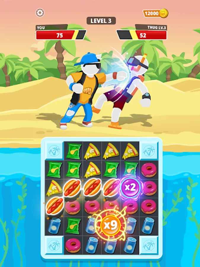 đ Who needs a varied diet? Match as many foodstuffs of the same type as you can in a single string to do maximum punching damage to your opponent đ. Long strings will give you multipliers for your next attack. But remember, youâll have to beat multiple opponents to get to the end of the level, and some are just as well-fed as you, so youâll need to ration your treats and strategize to break down match 3 barriers and build the ultimate combo attacks at just the right moment if you want to survive.
