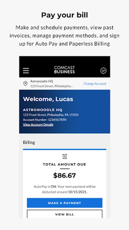 Access your Comcast Business account anytime and anywhere with the Comcast Business App—an innovative, all-in-one tool designed with your business in mind. With streamlined navigation and an intuitive layout, the Comcast Business App makes it easier than ever to manage your account on the go, right from your mobile device.