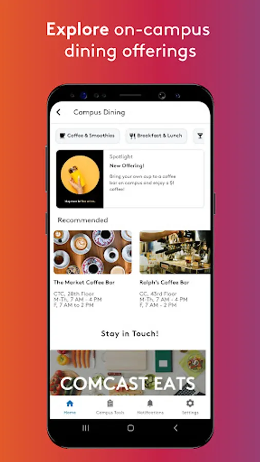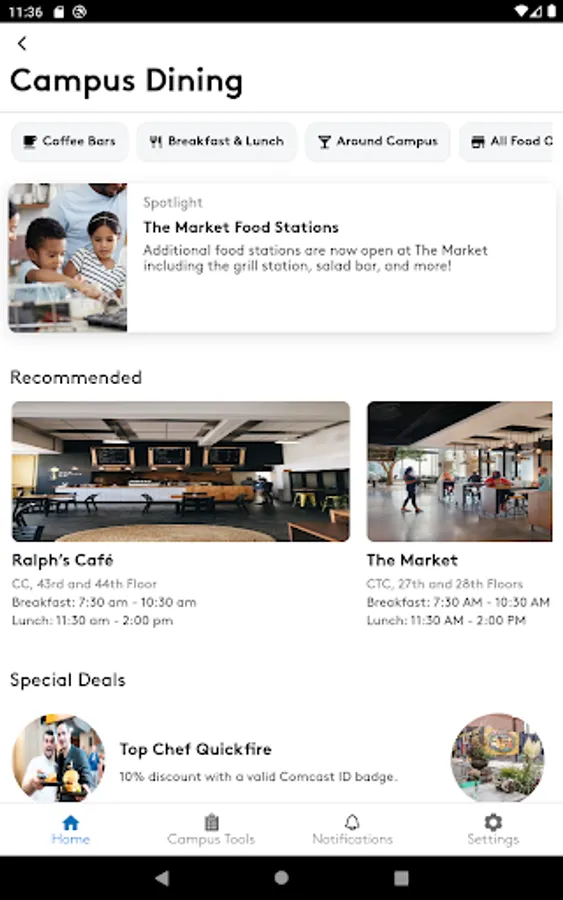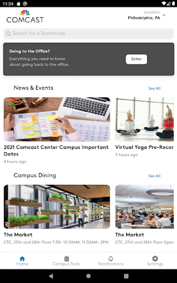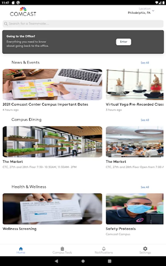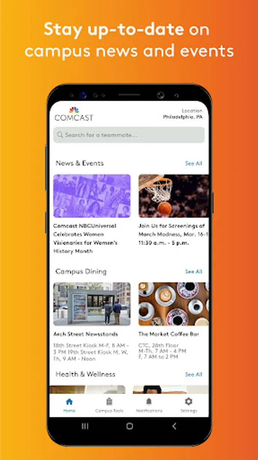The Comcast Campus App is designed to enhance the workplace experience by serving as a one-stop shop for resources Comcast teammates need on the go.