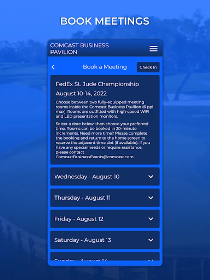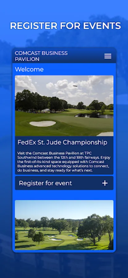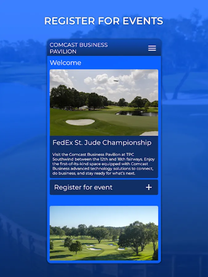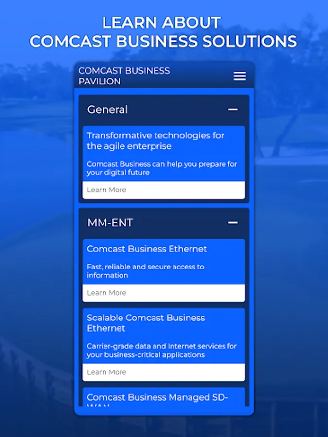 The Comcast Business Pavilion mobile app is your key to the Comcast Business Pavilion at select PGA TOUR events. Register to enjoy the first-of-its-kind space equipped with Comcast Business advanced technology solutions to connect, do business, and stay ready for what’s next.
