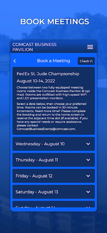 Use the app to book time in one of our two fully-equipped meeting rooms inside the Comcast Business Pavilion. Meeting rooms are outfitted with high-speed WiFi and LED presentation monitors.