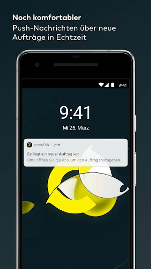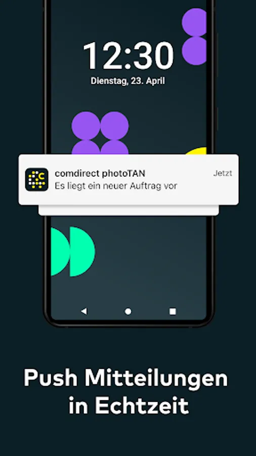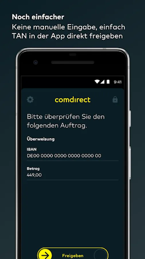 Your transaction will be automatically transferred to the comdirect photoTAN app and a notification will appear on your smartphone. When you tap on the message, the photoTAN app opens. Check the transaction and release the TAN by sliding the arrow from left to right.