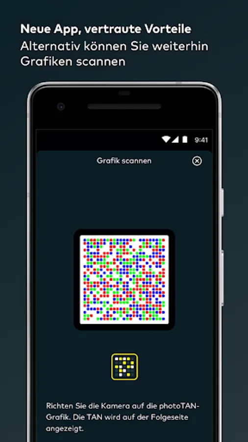 The usual scanning function of the comdirect photoTAN app is retained. This is recommended, for example, if your smartphone is not connected to the Internet. To do this, select the photoTAN procedure “photoTAN graphic” on your computer and then open the scan function at the bottom left of the comdirect photoTAN app on your smartphone.
