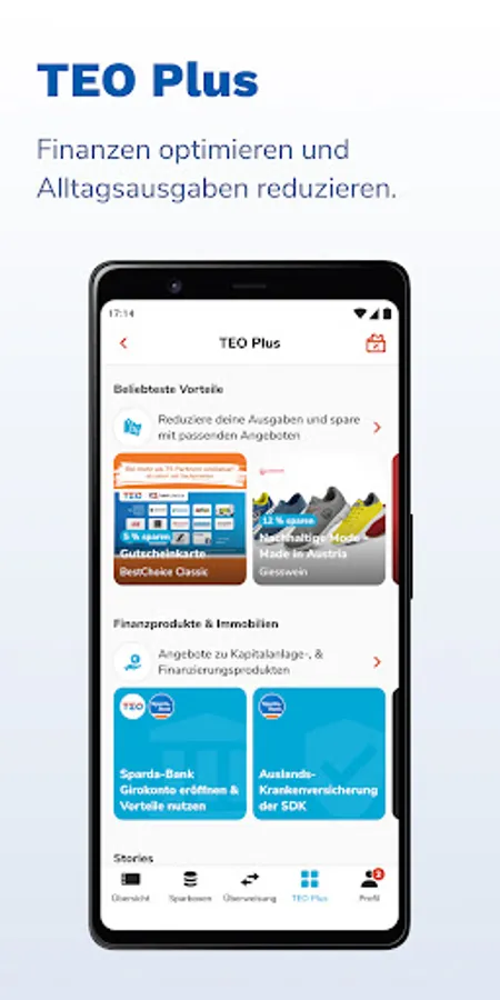 With TEO Plus you can optimize finances and reduce everyday expenses. In the “Partner Offers” category you will find suitable savings and value-added offers. In addition to a large selection of partner offers, (value) vouchers can also be purchased at a reduced price. The "Financial Products" category offers selected financial and insurance products for individual needs and circumstances. In addition, editorial and informative contributions invite you to read and discover.
