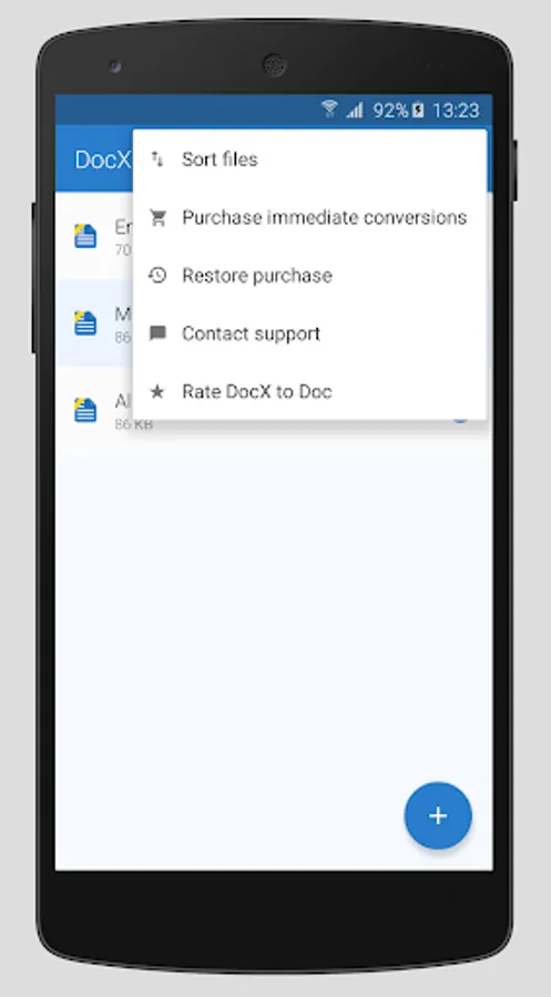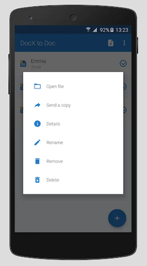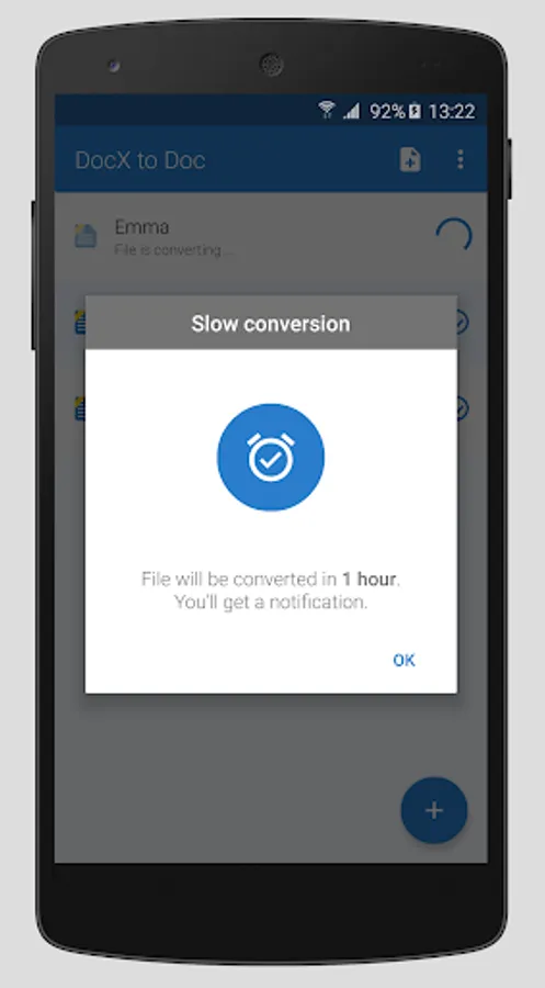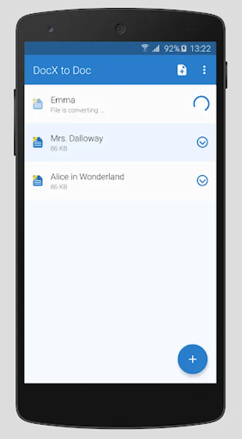 If you need a Microsoft Office doc file, not docx, which is becoming more prevalent, use this app to convert .docx to .doc. Some text editors or apps work better with the .doc format. Find your DOCX document and select it with DOCX to DOC converter. The conversion will start automatically. The newly converted file will then be downloaded to your Android device.