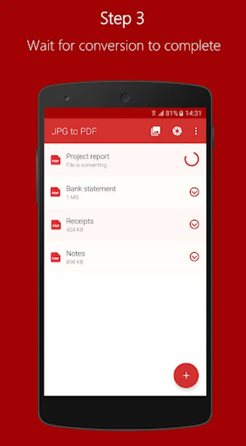 The easiest way to convert photos from your Android device to high-quality PDF documents. Just import the image or snap a photo of your notes, invoices, reports, certificates or other documents and convert your picture to PDF. Use JPEG to PDF Converter as a PDF scanner to scan and turn your scan to PDF on the go.