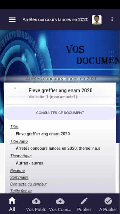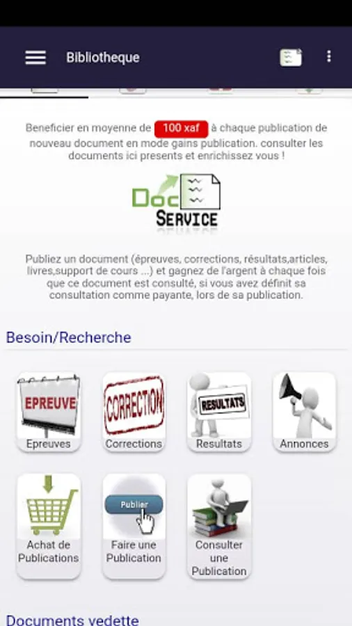With DocService, publish a document (test, correction, result, announcement, suggestion / tip, book, tutorial, course material, brochure, tutorials) related to a competition, an exam, a structural specialty (academic or not) or others free of charge by setting its consultation price, in order to benefit from the gains associated with each consultation.
