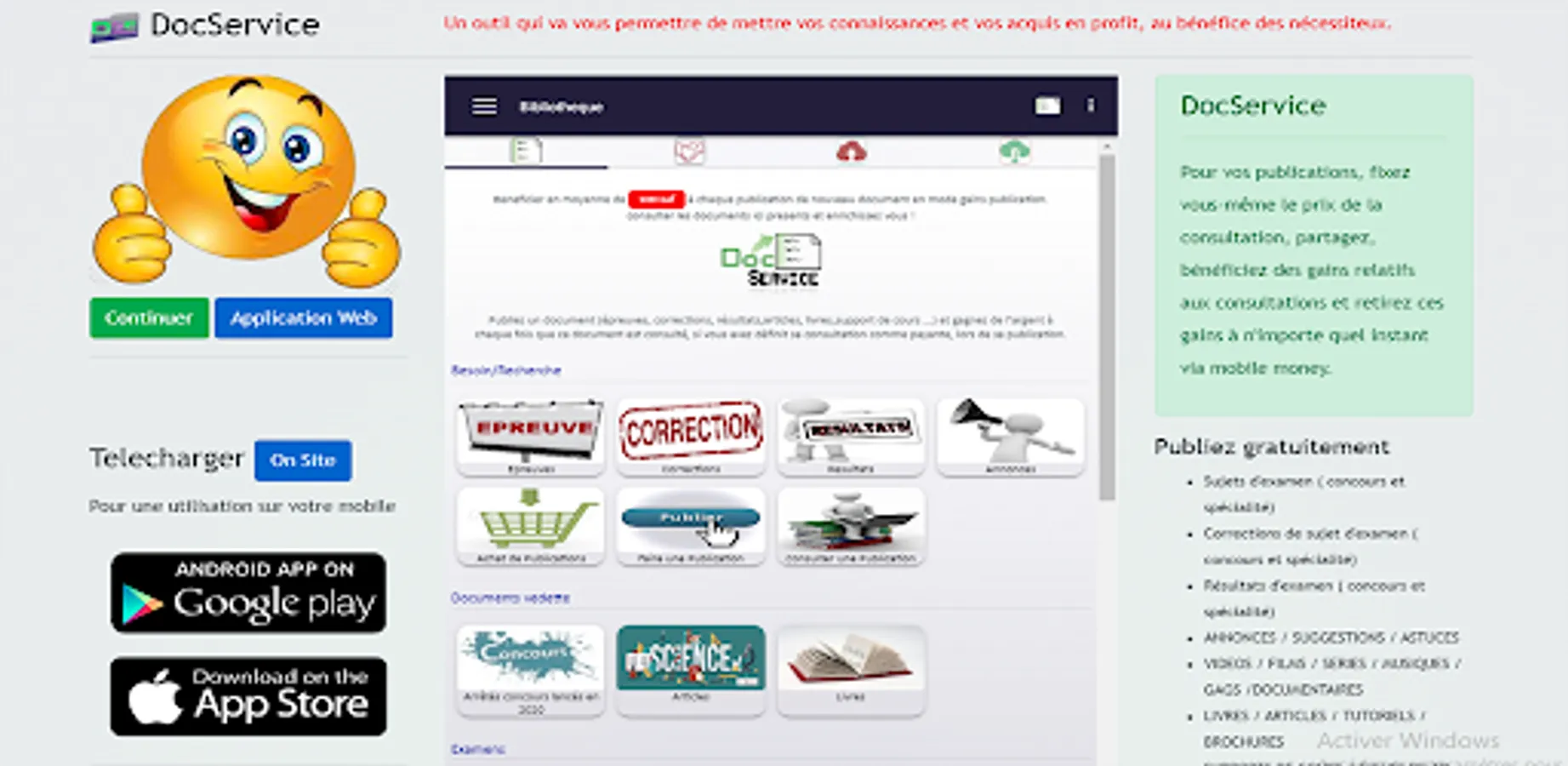 In our country, it is not uncommon to see a bac + 5 +, transformed into street vendors, taximan, ... in short, exercise an activity that has nothing to do with all the knowledge he has learned about benches. During a competition or exam it is very often a question of finding at all prices the tests of the previous sessions or of other establishments and associated corrections, we would therefore like to create our personalized "Borre" or we could to choose to put our tests and our corrections there. The documents for competitions, exams, classes, specialties, we have them in our cupboards, they are useless to us except to make a gift of them to the shopkeeper of the corner to often wrap us bread. mornings, all this data and much more is wealth for another individual across the country who is willing to pay a high price for it. docService is thus presented as an essential tool.