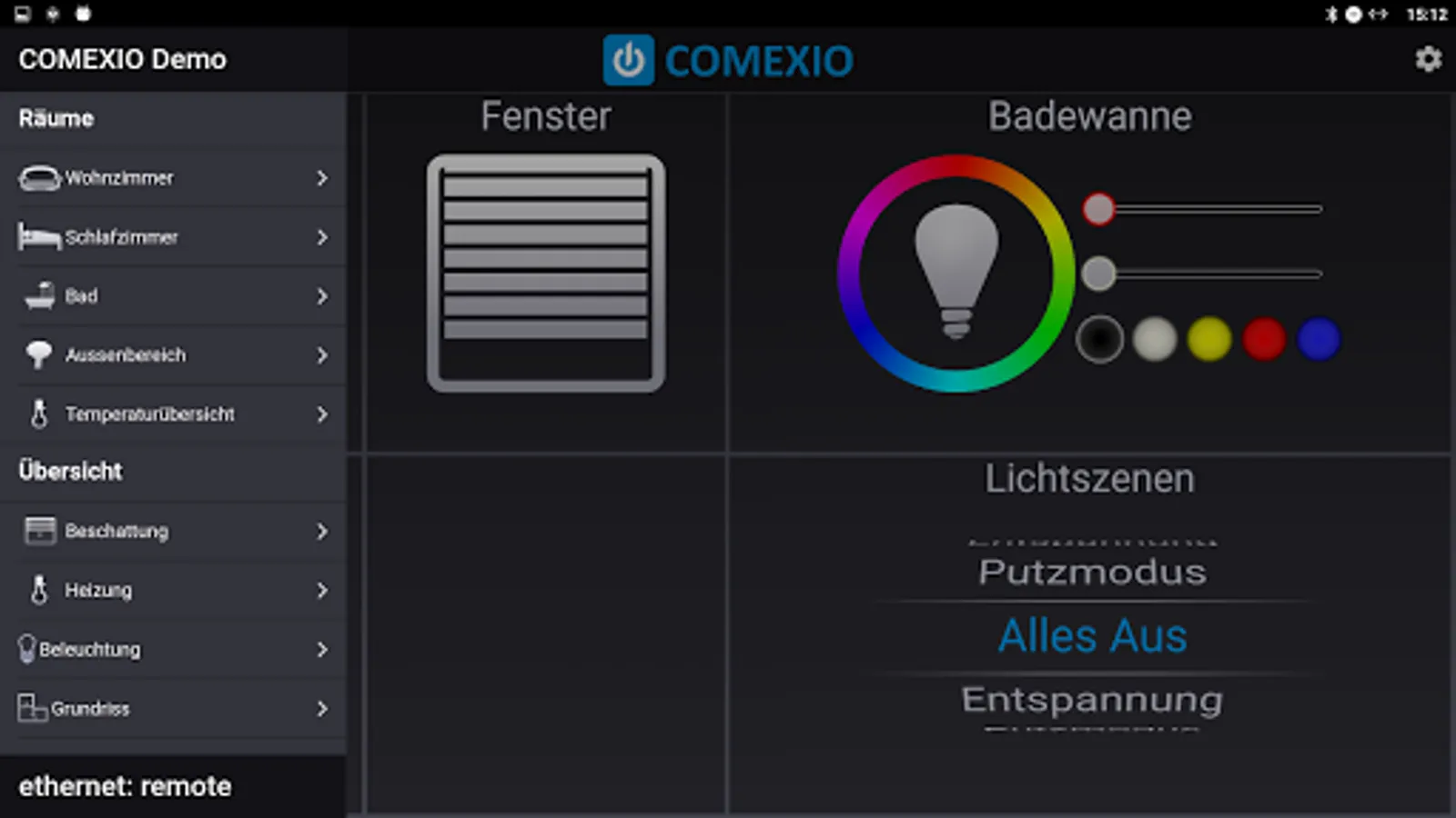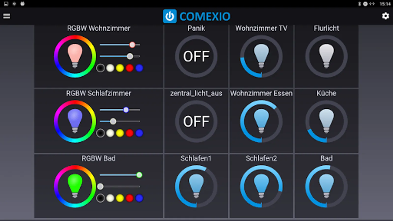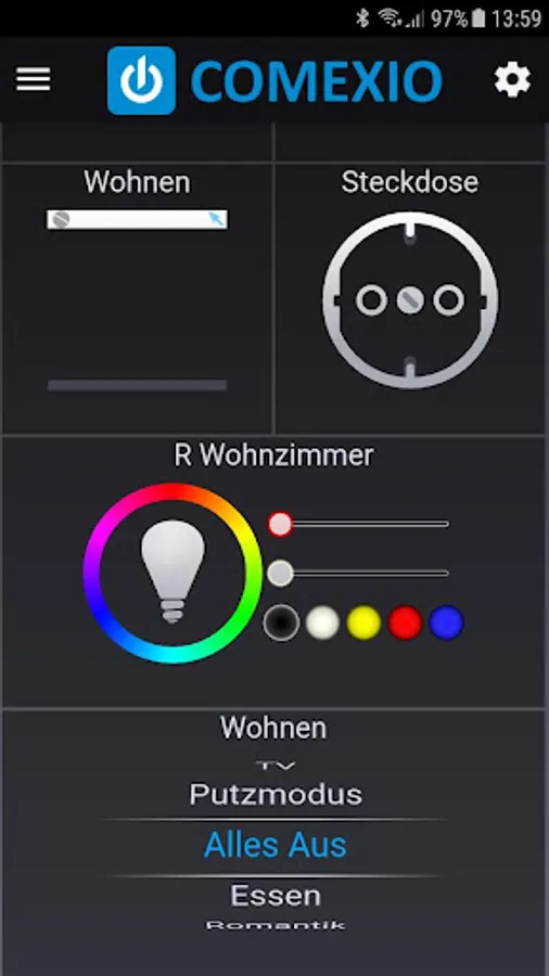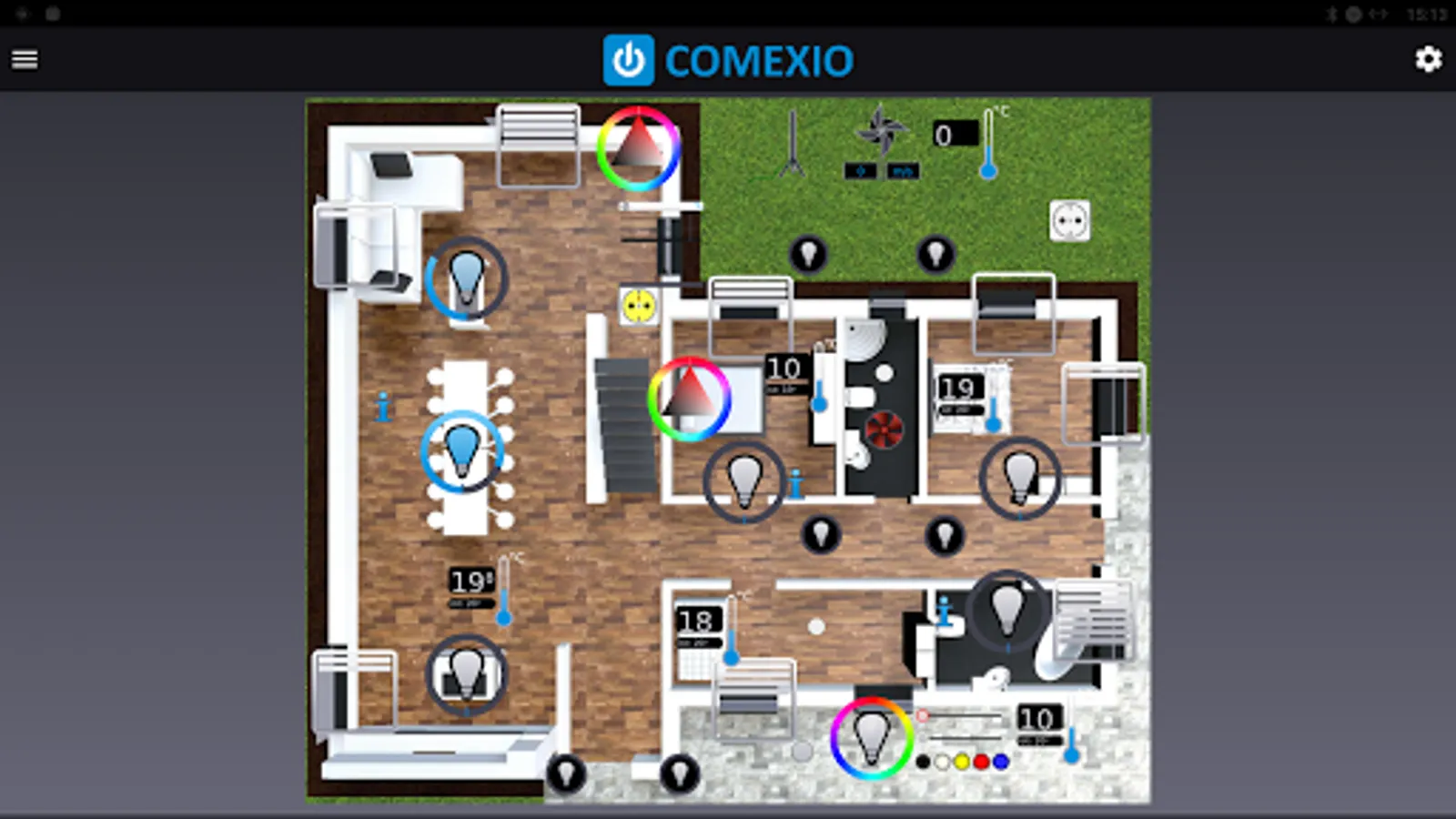 - Control of light, blinds, heating and all other involved in COMEXIO functions as usual
