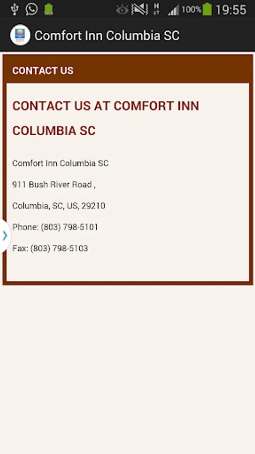 Book Comfort Inn Columbia SC quicker and easier than ever before. With the hotel’s app powered by BingoTravel Apps, connecting with this property directly and simply has never been more convenient. Do everything you need on your smart phone! This single property app lets you take a look at hotel features and amenities and glimpse useful photos -- anytime you want. And of course, you can book directly with this powerful application. Even better, do things around the clock without waiting on hold or dealing with a call center. To connect with this hotel now, download this app.