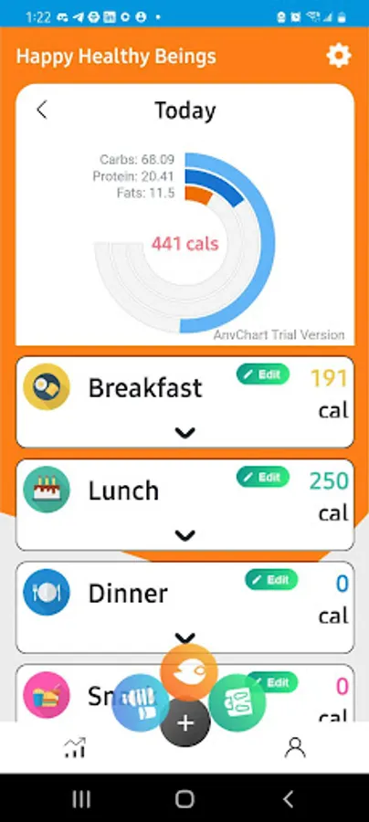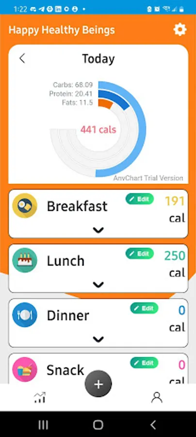 Happy Healthy Beings is a calorie tracking app that tracks what you eat and helps you stay within your nutritional goals. It has a graph that identifies the amount of carbs, proteins and fats you are eating.
