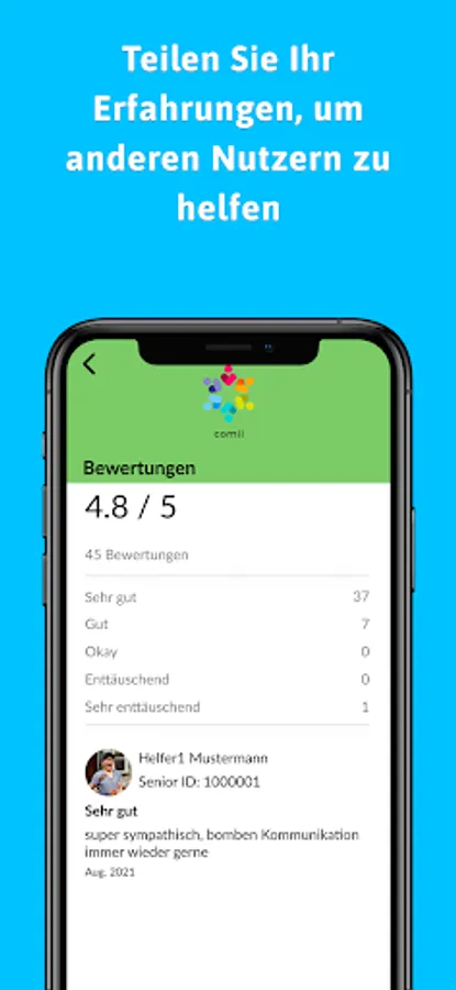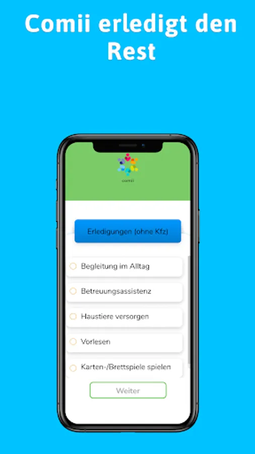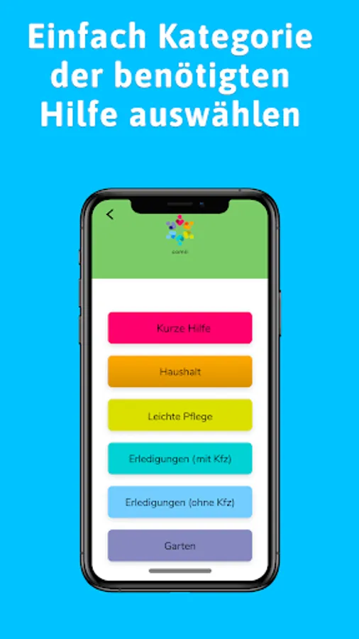 If necessary, the Comii Senior APP helps you to search for and commission everyday helpers directly. You can choose from different categories for this. Are you looking for help with shopping, in the garden (clearing snow, mowing the lawn, ...) or for accompaniment or transport to the doctor? With Comii you can hire everyday helpers in your area to support you at short notice.