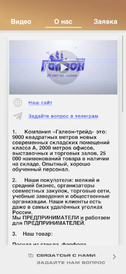 The Galleon-Trade company is: 9000 square meters of new modern warehouse premises of class A, 2000 meters of offices, exhibition and trading halls, 25,000 items of goods in stock. Experienced, well trained staff.