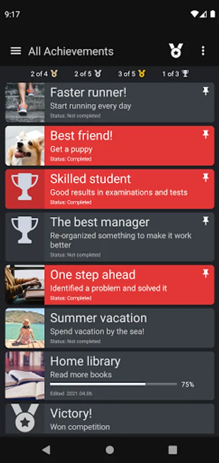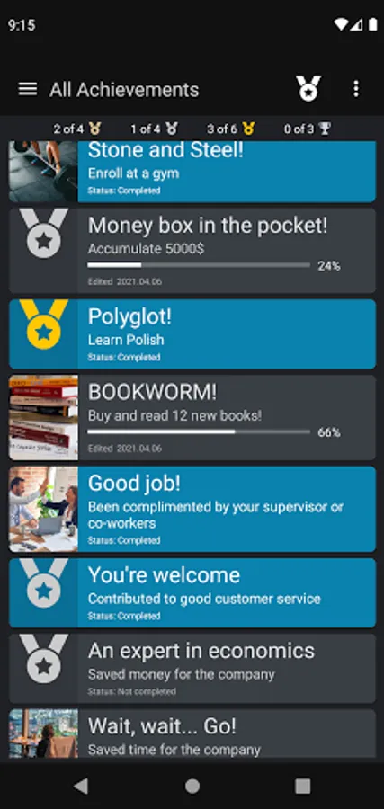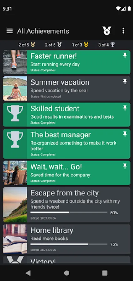 Achievements is a mobile app that turns your everyday tasks into exciting challenges. Whether you want to exercise, study, work, or have fun, you can set your own goals and track your progress in the app. Achievements makes your life more rewarding and enjoyable. Download Achievements today and start your adventure!