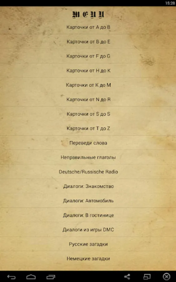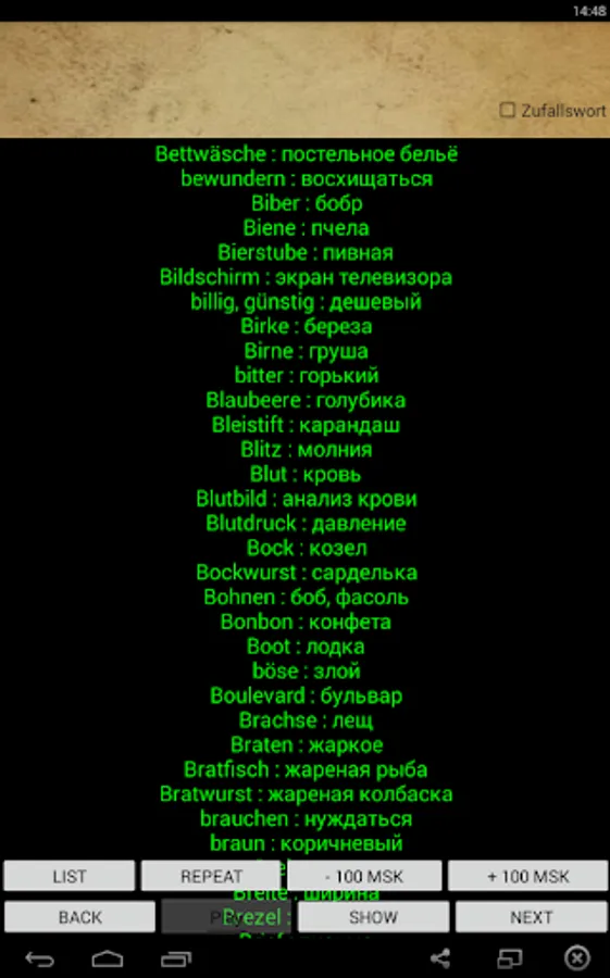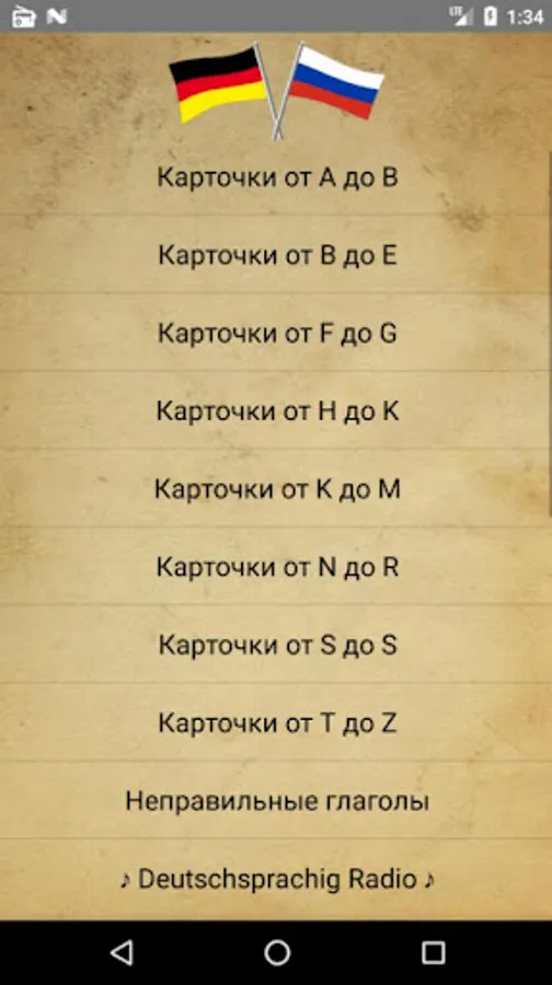 To quickly learn words in German / Russian - train your memory, according to the principle of question-answer. The program first shows the German word, then the translation in Russian (or vice versa). The program includes over 1800 words and 172 German irregular verbs, as well as dialogues