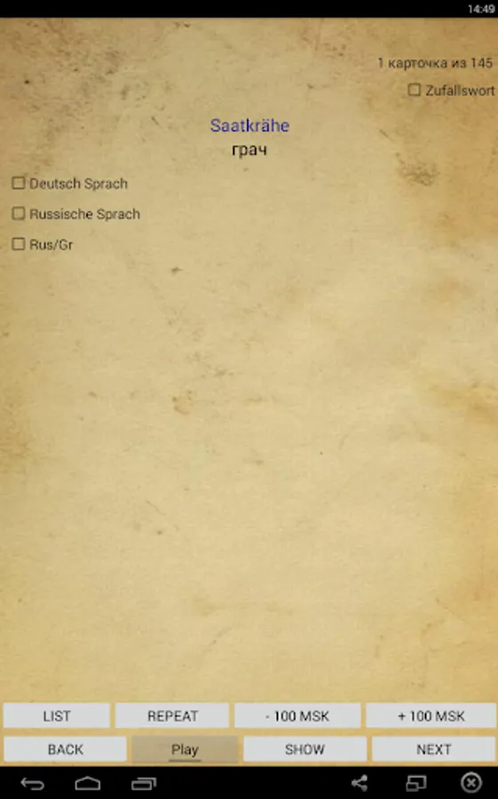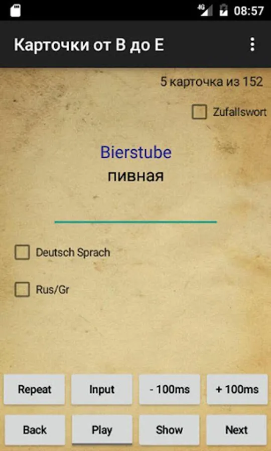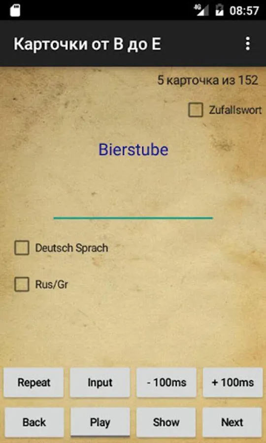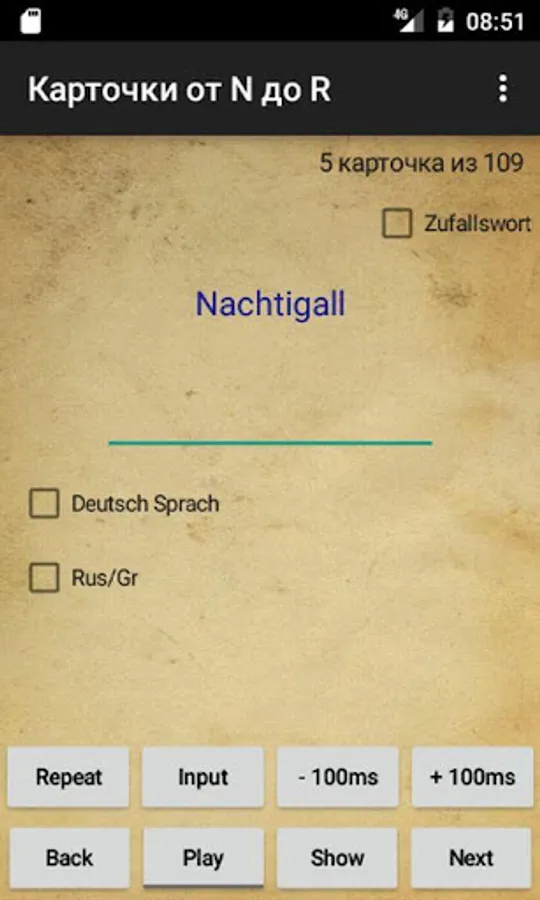 * Ability to turn on the speech synthesizer to listen to German words (for the synthesizer to be of high quality - install Google TTS).