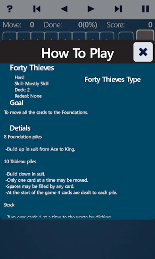 Forty Thieves Solitaire as you always did, completely free. This card game features the 1 million numbered deals that are identical to the ones on your desktop. You can replay it any time! Our version of forty thieves solitaire takes the classic card game and takes it to the next level.