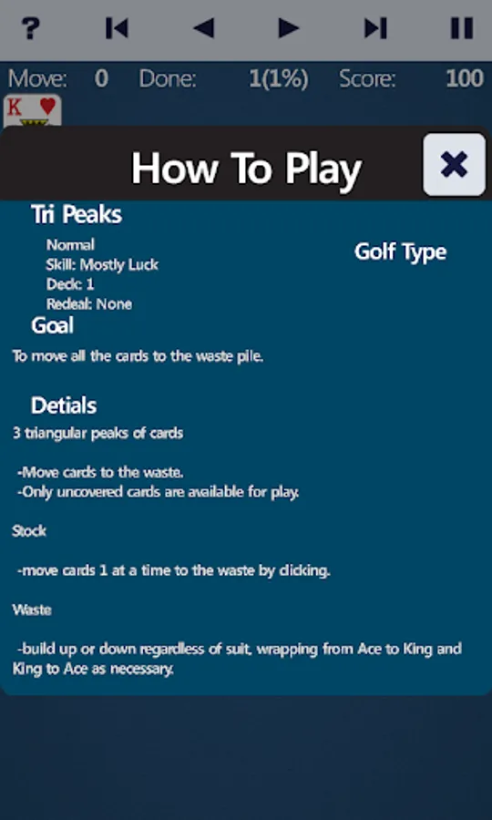 TriPeaks (also known as Tri Towers, Triple Peaks or Three Peaks) is a fun solitaire card game that combines elements from Golf Solitaire.
