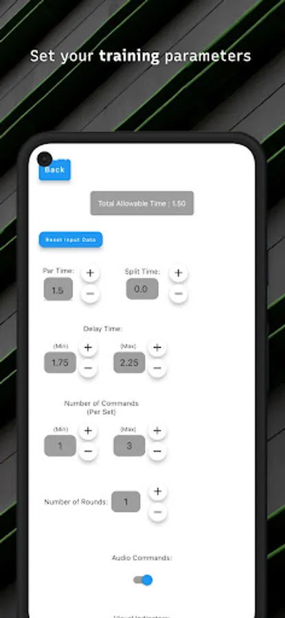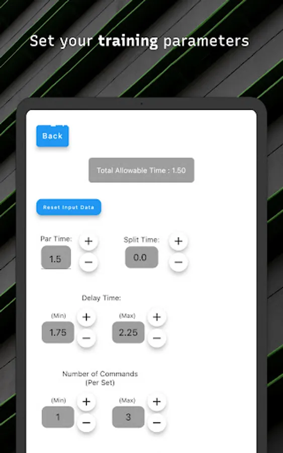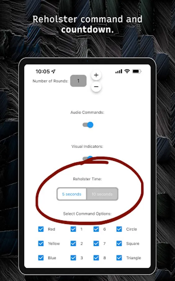 After selecting the random commands, par time, split time, and the number of shots to be fired, the Command Target Shot Timer App will call out a random command followed by an audible buzz alerting the user that the par time has expired.