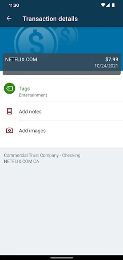 - Keep your transactions organized by allowing you to add tags, notes and photos of receipts and checks.