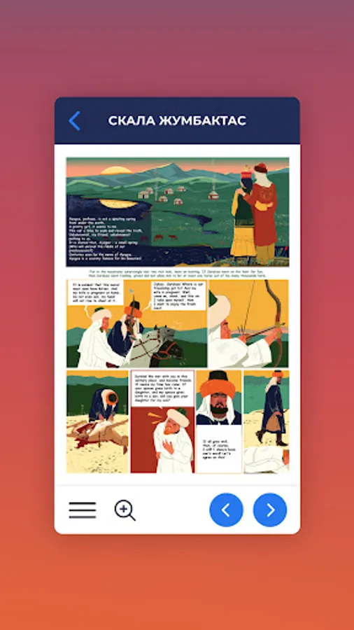 Comic book "Rock Zhumbaktas". According to legend, the daughter of a rich boy escaped with her lover, a poor akyn, from her father. But the young failed to hide. The sons of the bay with their arrows killed the rootless horseman.