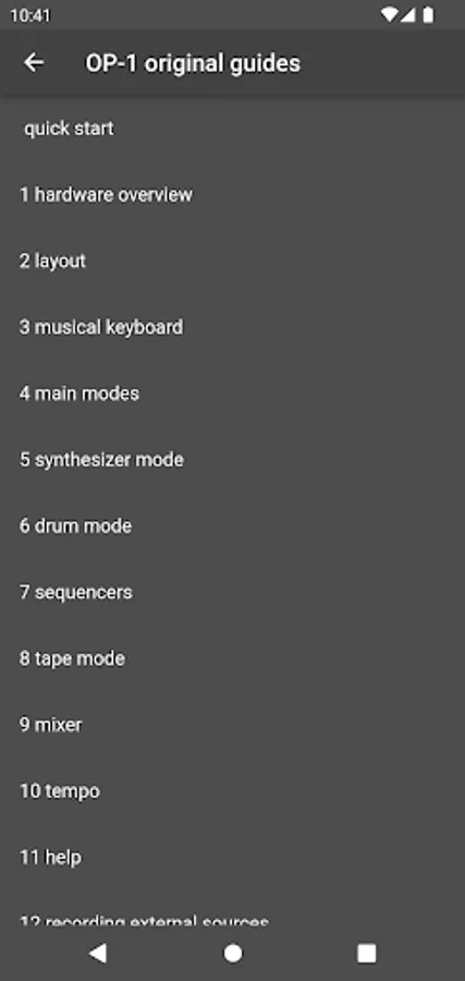 This app provides offline access to the guides for the original OP-1, the OP-1 field, and other teenage engineering products. If you are flying, in a desert, or just off the grid, you'll still have access to the guides from teenage engineering on how to use your devices and experience some great music.