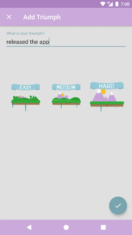 Those initial zeros can be intimidating, but once you click the plus button and add your first easy, medium, or hard triumph, you'll feel encouraged to keep doing more. You can also title your triumphs and view them by difficulty for an extra boost of confidence.