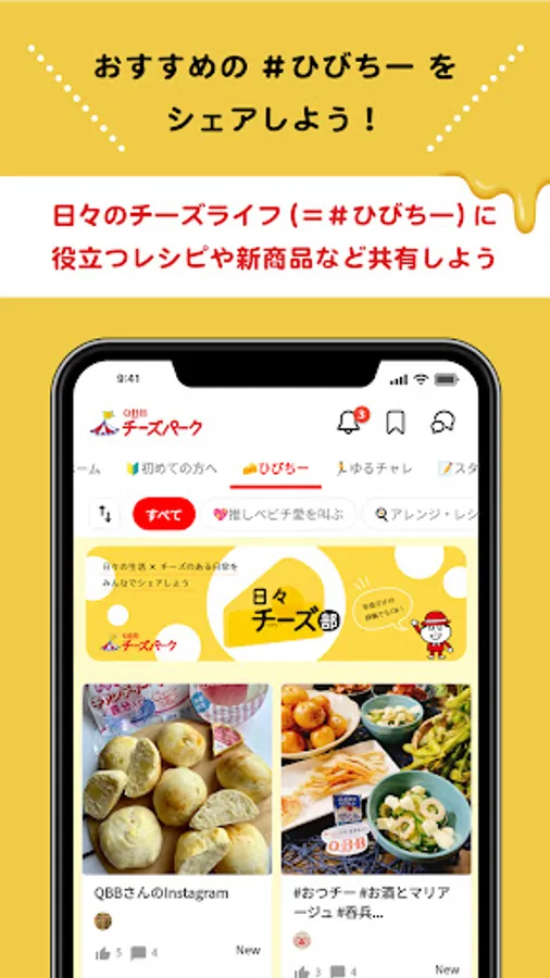Members can easily post, like, and comment on recipes and new product information that are useful for daily cheese life (= Hibichi), and exchange information that is useful for mental and physical support. I can.