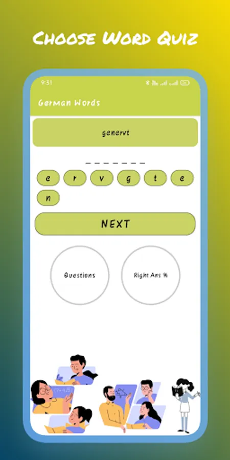 After the completion of the first segment, the quiz section starts from the Q/A quiz section. Learners will get a series of jumbled words one by one and have to rearrange the letters for making a meaningful word. This quiz round of learning German words contains easy as well as tough jumbled words so that users of any age can play the quiz. Learners will rearrange the words just by tapping on the letters.