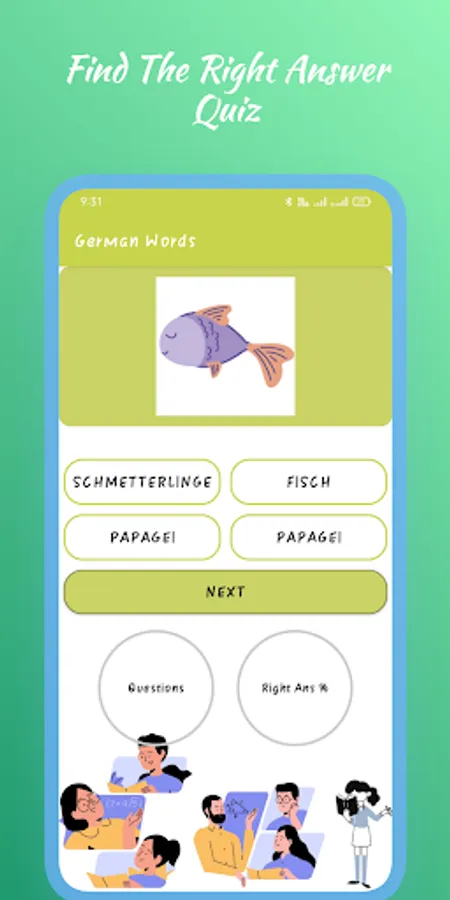 The image quiz section of the learn German words(deutsche Wörter lernen)application is preferable for kids and teenagers. Learners will get different pictures and according to those pictures they have to guess the correct option from below. After choosing every correct answer learners will get the correct answer percentage increased. The image quizzes are mostly from easy to intermediate levels.